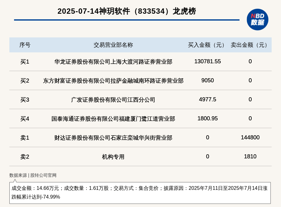 近日,新三板基础层企业神玥软件(股票代码:833534)引起市场广泛关注。据悉,该公司在2025年7月14日成功登上龙虎榜,此次上榜的交易方式是通过集合竞价完成的。引起市场注意的原因是,从7月11日至7月14日,神玥软件的股价累计下跌幅度达到了惊人的74.99%。