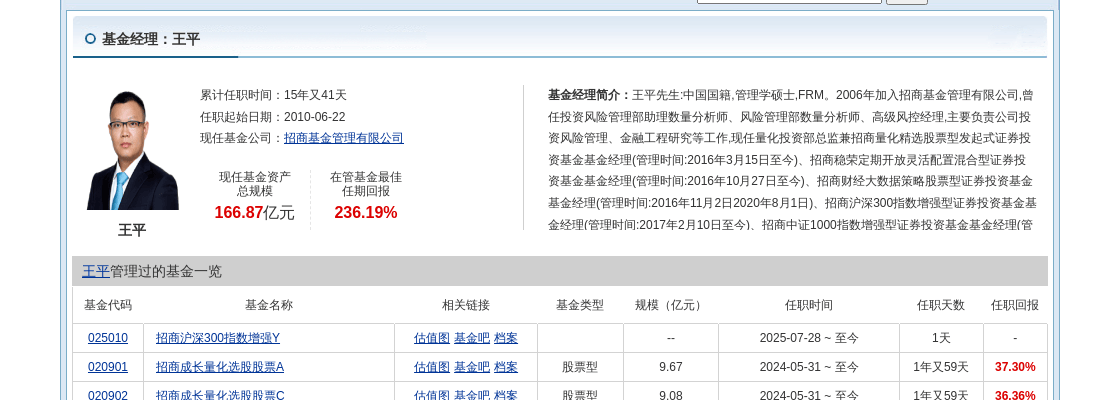 招商量化精选股票A基金的背后,是经验丰富的基金经理王平。王平先生拥有中国国籍,管理学硕士学位,并且是金融风险管理师(FRM)。自2006年加入招商基金管理有限公司以来,他历任多个职位,积累了丰富的投资风险管理和金融工程研究经验。目前,他担任量化投资部总监,并管理着多只基金,包括招商量化精选股票型发起式证券投资基金等。