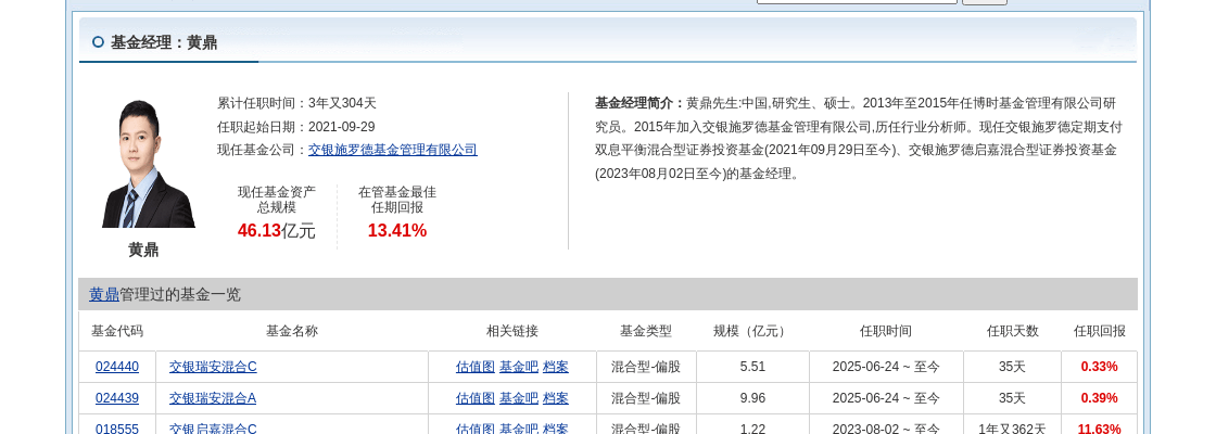 黄鼎,同样是中国籍,研究生学历,硕士学位。他在博时基金管理有限公司担任研究员两年后,于2015年加入交银施罗德,现任交银施罗德定期支付双息平衡混合型证券投资基金的基金经理。黄鼎在基金管理领域积累了丰富的经验,他的投资策略和眼光备受业界认可。