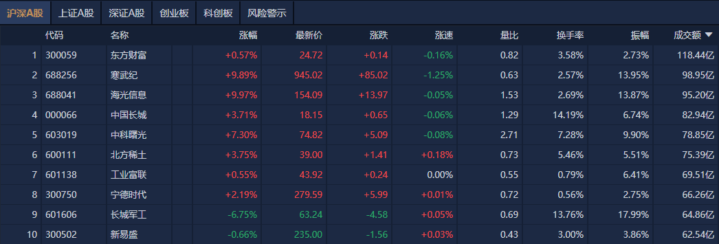 个股成交额方面,东方财富以超过118亿元的成交额位居首位,紧随其后的是寒武纪、海光信息和中国长城,这些股票的成交额也均处于较高水平。