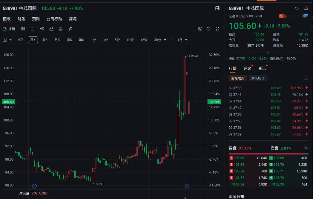 经历一周停牌后,中芯国际A股今日正式恢复交易。开盘阶段,A股股价低开11.12%,而同期停牌的H股在此前累计跌幅已超4%,今日股价波动相对平稳。