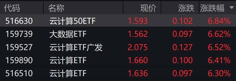 盘面上,跟踪中证云计算与大数据主题指数的交易型开放式指数基金(ETF)涨幅超过6%,成为市场关注的焦点。该指数由50只成分股构成,覆盖提供云计算服务、大数据服务以及相关硬件设备的上市公司,旨在全面反映这一领域上市公司的整体表现。