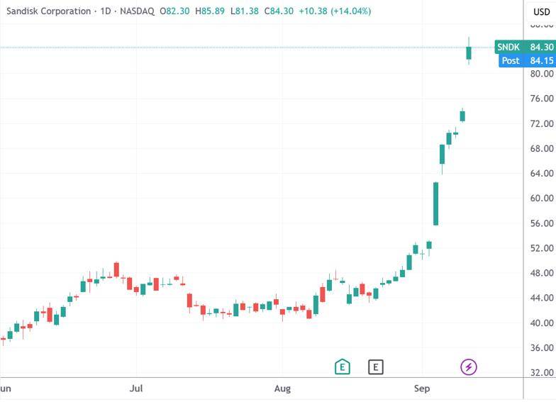 周四美股收盘时,存储芯片行业迎来显著上涨,美光科技股价飙升7.55%,闪迪(Sandisk)涨幅达14%,两家公司均连续七个交易日实现阳线拉升,引发市场高度关注。