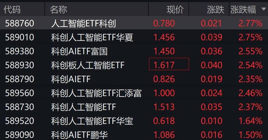 市场资金流向显示,多只跟踪上证科创板人工智能指数的交易型开放式指数基金(ETF)同步上涨,涨幅均超过2%。这类被动投资产品因重仓股表现突出而获得资金青睐,进一步印证了市场对人工智能赛道的持续关注。