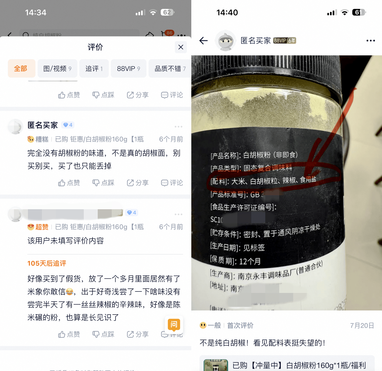 在电商平台的评价区,不少消费者对这款产品提出质疑。有买家评论称“完全没有胡椒粉的味道,不是真的胡椒面,买回来只能丢掉”,还有人表示“配料表里大米排第一,几块钱一大瓶,没注意看就买了,结果根本没法吃,太浪费了”。