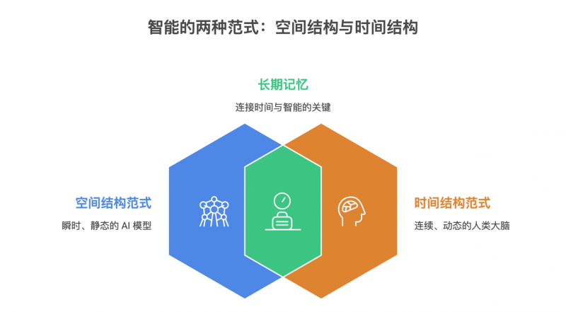 今年10月27-28日,他在天桥脑科学研究院在美国旧金山举办的首届天桥脑科学研究院AI驱动科学研讨会(Symposium for AI Accelerated Science,AIAS 2025)上系统阐述了包括“长期记忆”在内的发现式智能五种核心能力。他指出,当今的 AI 建立在 “空间结构”范式 之上——这种范式是「瞬时的」「静态的」,本质上通过规模化参数去拟合世界的“快照”;而人类大脑的 “时间结构”范式 是「连续的」「动态的」,其目的在于管理与预测时间流中的信息。在这其中,“长期记忆”正是连接时间与智能的关键环节。