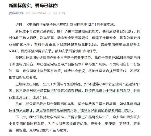 另一家知名企业爱玛科技集团也发表声明,表示已提前完成全系产品的技术升级与生产切换,全面拥护新国标的实施。公司强调,其推出的符合新标准的车型在座椅设计、安全性能等方面进行了针对性优化,能够很好地满足消费者日常出行场景的需求。爱玛还承诺,将持续以高标准推进产品研发,为消费者提供更智能、更绿色的出行产品与服务。