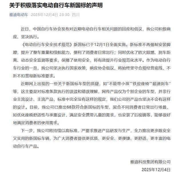 作为行业领军企业,雅迪科技集团有限公司迅速响应协会倡议,发布声明称已全面执行新国标要求。公司表示,目前已推出68款符合新标准的车型,这些产品在座椅舒适性、承重设计以及安全性方面进行了优化,能够满足安全携带儿童的需求,并配备了后视镜等实用配置。雅迪承诺,将继续以高标准、严要求推进产品研发与生产,为消费者提供更优质、更安全、更便捷的出行选择。