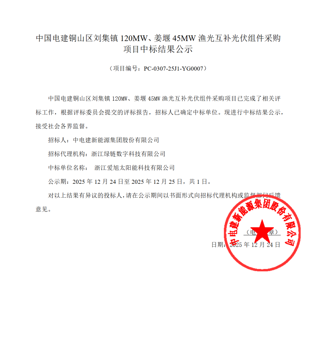 日前,中国电建铜山区刘集镇120MW、姜堰45MW(直流侧共计184MW)渔光互补光伏组件采购项目中标结果公示,浙江爱旭成功中标,再次彰显了爱旭ABC组件在集中式电站场景的强劲竞争力。
