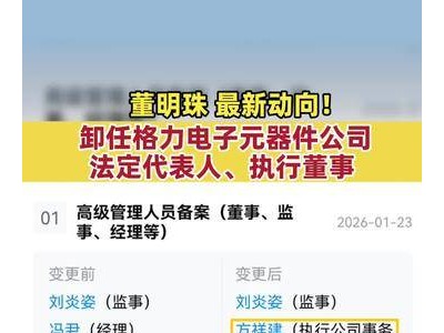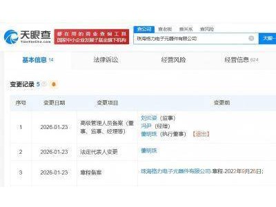近日,珠海格力电子元器件有限公司完成工商信息变更,原法定代表人、执行董事董明珠卸任,由格力电器副总裁方祥建接任法定代表人并出任执行公司事务董事。方祥建自2021年11月起担任格力电器副总裁,此次调整被视为公司管理架构的常规优化。