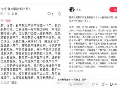 针对“断指计划”这一说法,俞浩明确否认其存在,并强调公司从未实施过所谓“翻倍薪资挖角”的策略。他表示,追觅科技在招聘时严格控制薪资涨幅,通常不超过20%,认为“短期高薪挖人会导致双方心理失衡,不利于长期合作”。他进一步指出,企业需要的是能够共同成长的团队,而非通过短期利益驱动的人才流动。